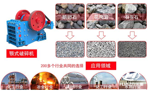 顎式破碎機主要適用于冶金、礦山、化工、建材、公路、鐵路、水利等行業(yè),對各種礦石和大塊物料的中碎和細碎,用于破碎不同硬度的巖石,例如河卵石,花崗巖,青石,石灰石等。被破碎物料的高抗壓強度為2000kg/cm2。