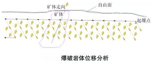 對(duì)于貴金屬礦山,礦石的損失、貧化控制非常重要。因此,在礦石區(qū)域?yàn)榱丝刂茙r體位置的移動(dòng),用軟件對(duì)臺(tái)階的分區(qū)布孔,使用高精度導(dǎo)爆管雷管或數(shù)碼電子雷管,逐孔起爆網(wǎng)路進(jìn)行設(shè)計(jì)、模擬,精確控制起爆順序,使巖體移動(dòng)方向與礦體走向一致(見圖),并通過(guò)測(cè)量炮孔爆破后的實(shí)際位移量指導(dǎo)礦石的挖掘,最大程度的避免礦石與廢石混雜,以減小采掘時(shí)礦石的損失、貧化。