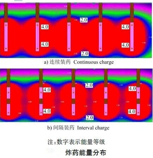 通過(guò)爆破專業(yè)軟件分析裝藥炮孔周圍的能量分布時(shí),需要考慮炸藥密度和炸藥體積強(qiáng)度以及炮孔空氣間隔和分段裝藥等因素。通過(guò)模擬炸藥能量在炮孔垂直斷面和水平斷面上的分布,并以等值線圖可視化顯示(見圖),判斷裝藥量和裝藥結(jié)構(gòu)設(shè)計(jì)的合理性。