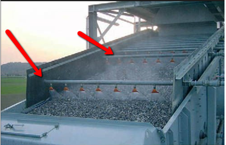 在產(chǎn)生粉塵的入料口、出料口和破碎腔這三個(gè)主要部位設(shè)置噴水裝置,每處各設(shè)置兩個(gè)噴水嘴。其中,入料口處兩個(gè)噴嘴指向入料口;出料口處兩個(gè)噴嘴相對(duì)形成一定角度,使噴出的霧水成交叉狀態(tài),達(dá)到最佳噴霧效果,振動(dòng)篩上噴頭裝在頂層篩網(wǎng)上方。