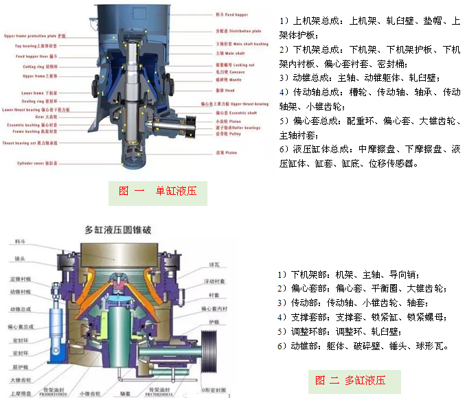 | 結(jié)構(gòu)組成 | 上機(jī)架,下機(jī)架,動(dòng)錐,傳動(dòng)軸,偏心套,液壓缸體 | 下機(jī)架,偏心套,傳動(dòng),支撐套,調(diào)整環(huán),動(dòng)錐 | 附圖一、圖二 |